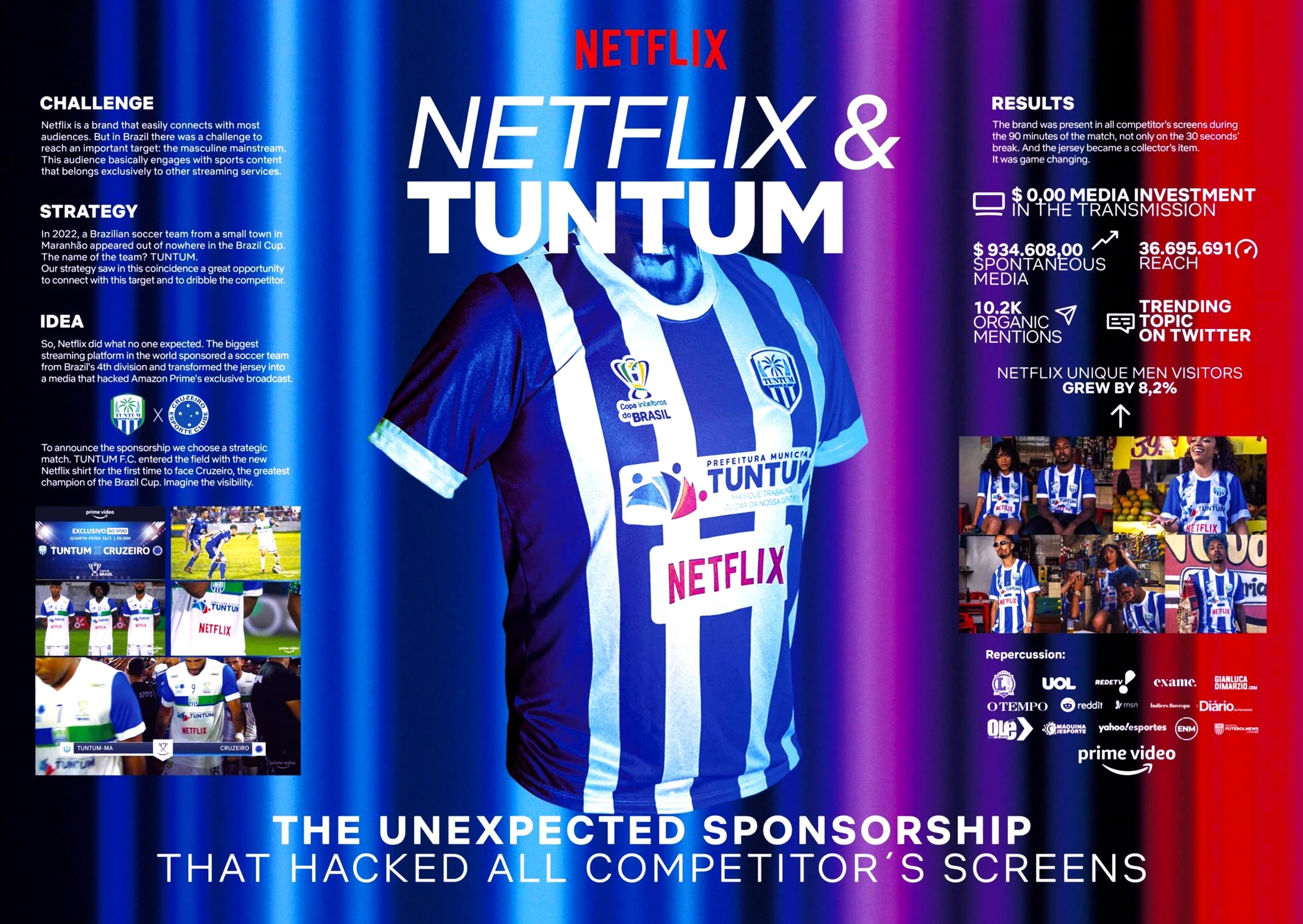 Netflix needed to reach the masculine mainstream audience, so we went exactly where they were: watching football. Instead of buying media, we sponsored Tuntum, a fourth division team from Maranhão making their Brazil's Cup debut against Cruzeiro, a six-time tournament champion.